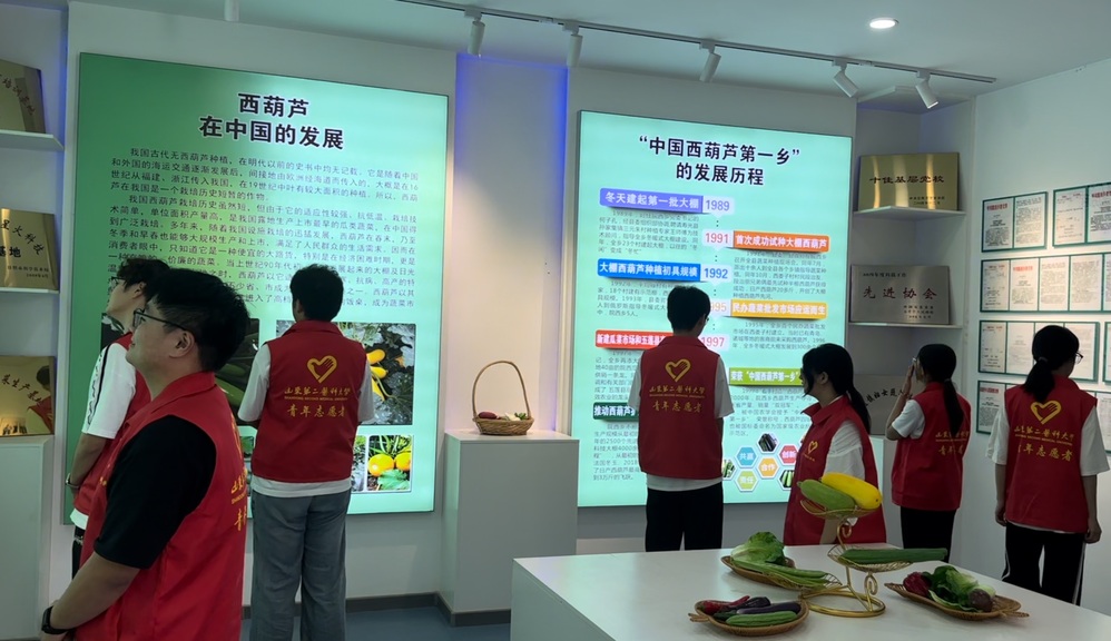 访企助农助宣传,经济振兴新动力。志愿服务队走进乡间,参观种植大棚园区和西葫芦展馆,从育种播种和实物展示等方面了解当地特色农业,塑造特色形象,打造品牌效应;赴昌德购物袋加工厂了解返乡青年孙明浩创业初衷,志愿者现场体验裁剪、印刷、缝纫、包装等技术,感受客户沟通、产品制作的亲力亲为,学习创业精神,激励同学们敢为人先,勇于闯出自己一片天地。