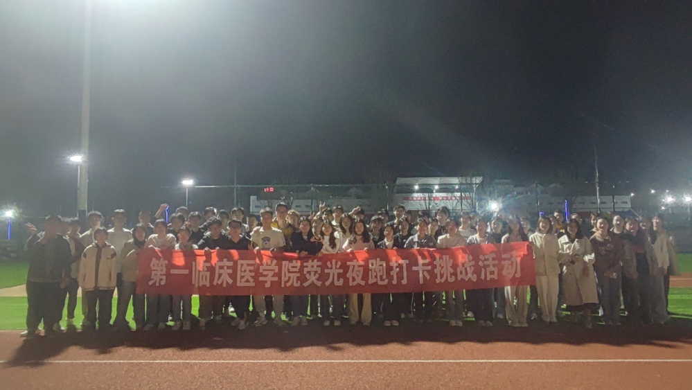 活动开始前,同学们提前到达东操场开始地点热身,调试设备,分发荧光手环,为夜跑活动做准备。活动中同学们通过运动挥洒汗水、释放压力,在慢跑中体会到运动的趣味性,完成情况通过“keep”运动软件呈现,在活动结束后,同学们在横幅上签名合影留念,既体现了对运动的热爱与坚持,也展现了作为医学生对现代健康观的理解和重视。