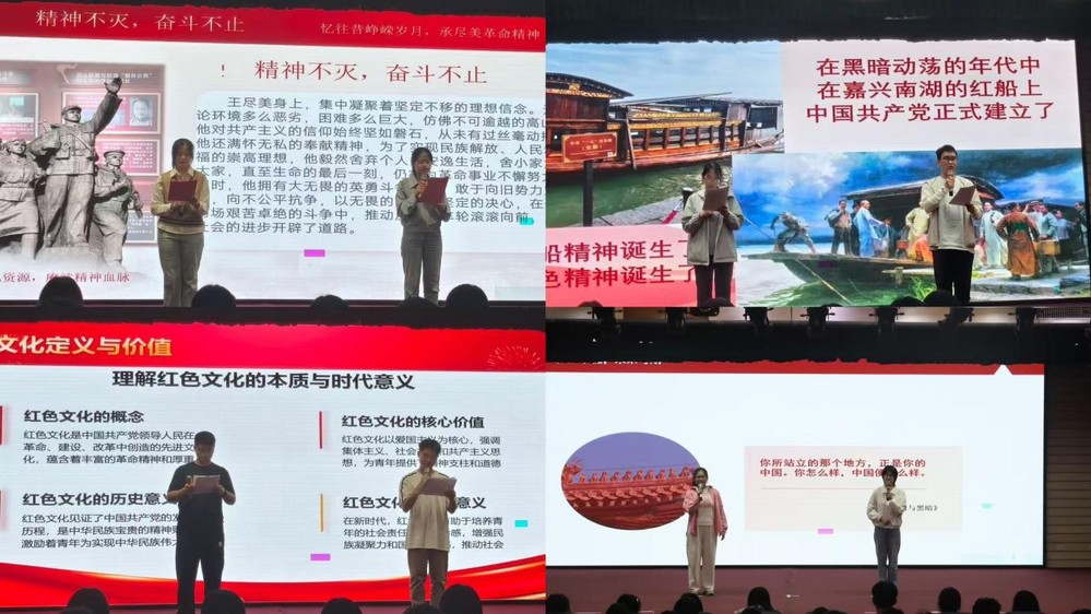 本次活动采取双人演讲的模式,演讲环节中,演讲者们默契配合,以饱满的热情、铿锵有力的语言,讲述革命先辈的英勇事迹、红色经典故事,诠释红色精神内涵,带领现场学生重温波澜壮阔的历史,从不同角度诠释红色精神的内涵与时代价值,展现新时代青年传承红色精神的生动实践。