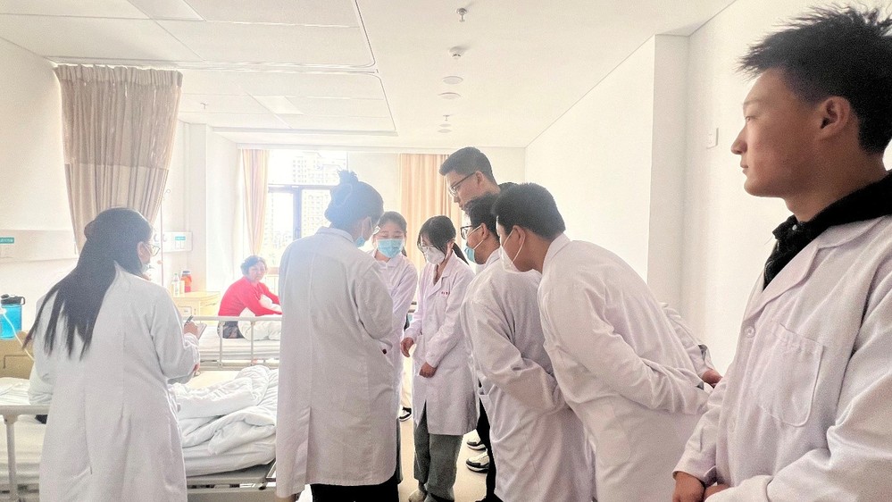 活动当天,学生党员和入党积极分子身着隔离衣,走进潍坊市人民医院的病房。隔离衣不仅是他们职业的象征,更是他们守护健康的坚定信念和实际行动的体现。在带教老师的悉心指导下,同学们深入病房,与患者面对面交流,参与病情分析与诊疗方案的讨论。在病房内,氛围专注而温暖。带教老师一丝不苟地进行病情分析,给出清晰高效的诊疗指令,同学们在一旁认真聆听、仔细观察。他们不仅学习到了专业技能和诊疗方法,更深刻感受到了人文关怀在医疗工作中的重要性。党员周师煊感慨地说:“通过这次活动,我们学习到的不仅是疾病的评估与治疗方案的讨论,更是如何将党的群众路线落实到细微之处,真正做到‘想患者之所想,急患者之所急’。”