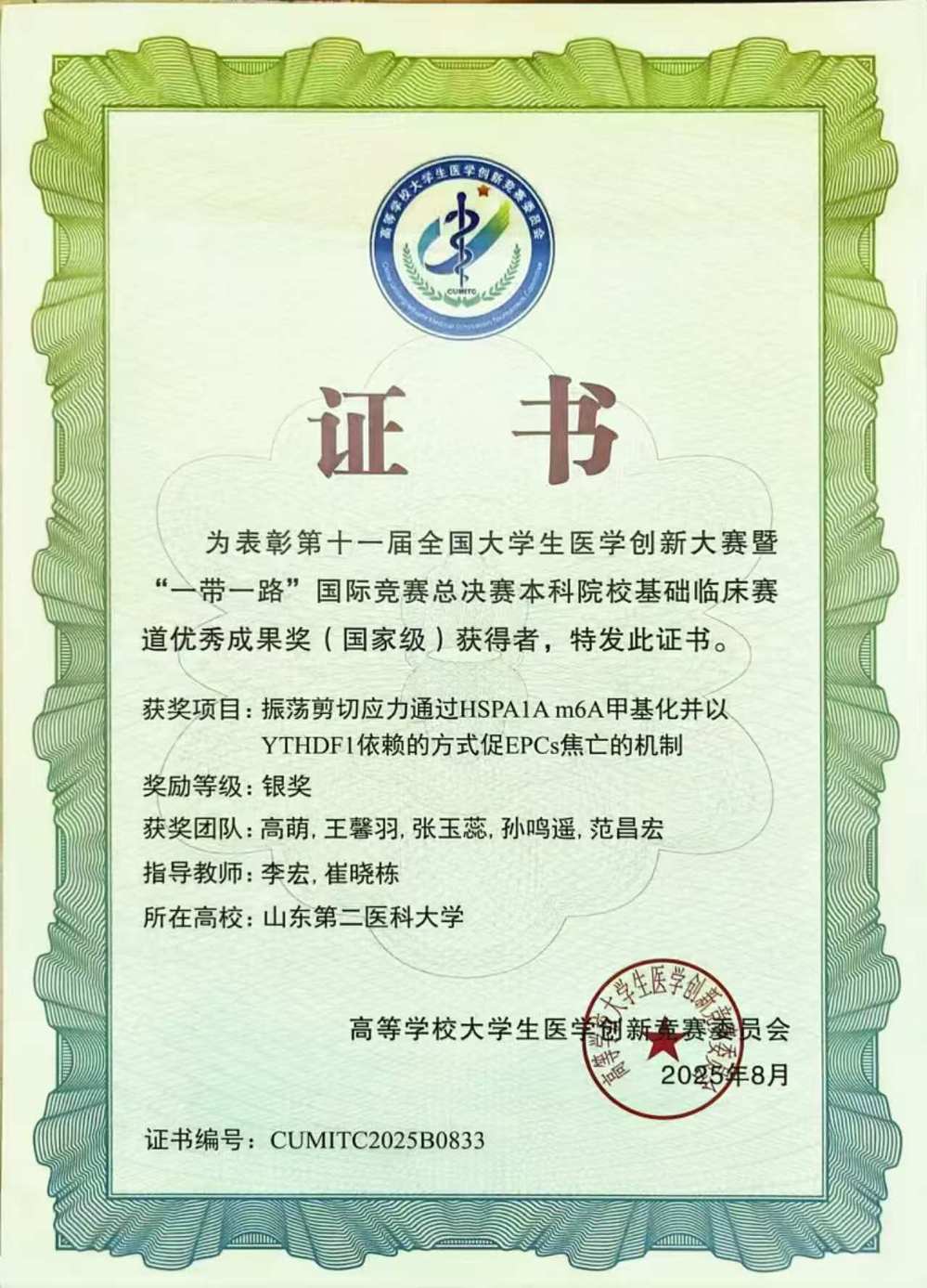 在激烈竞争中,我院2023级本科生高萌带领的团队凭借卓越的创新能力和扎实的专业素养脱颖而出,荣获国家级银奖。该团队围绕振荡剪切应力作用下导致内皮组细胞焦亡这一前沿科学问题展开深入研究,创新性地揭示了振荡剪切应力通过HSPA1A m6A修饰并以YTHDF1依赖的方式促进内皮祖细胞焦亡的作用机制。这一发现为临床靶向m6A修饰治疗动脉粥样硬化提供了新的理论依据和治疗思路。